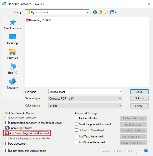 If the "Enable Save As" option is checked on the Printer Manager > General tab, the Save As dialog is displayed every time when printing a document to the Black Ice Printer Driver. To add a cover page, enable the Add Cover Page to the document option and click on the Save button.