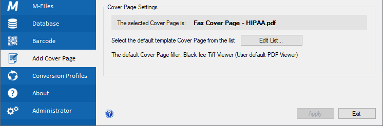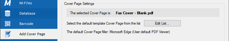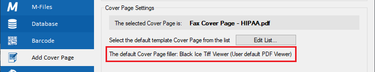 Under the Cover Page Settings section of the Add Cover Page tab, information can be seen on the currently selected cover page, the user's default cover page filler application, and the user can select a default cover page and edit the list of the cover pages available.