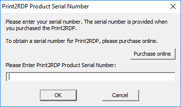 Enter the serial number in the text field and press OK. The serial number is in the body of the email containing download instructions for Print2RDP.