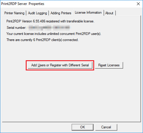 2., Once our sales department has confirmed and provided your transferable license, go to Print2RDP Server > License Information > Register with different serial button and enter the new transferable serial number.