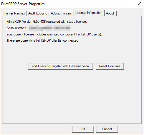 Print2RDP is licensed by Concurrent Users, with 1 (one) Server license included. Currently the Print2RDP offers two types of licenses: