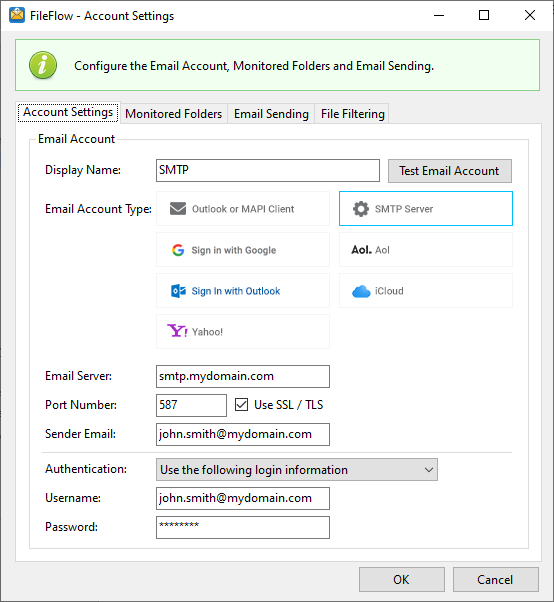 The FileFlow is a service-based 24/7 email-sending application, that runs in the background, actively monitors predefined folders, and silently sends incoming documents as attachments in email with preconfigured email settings. The FileFlow provides an easy-to-use, intuitive user interface for configuring email sending and folder monitoring.