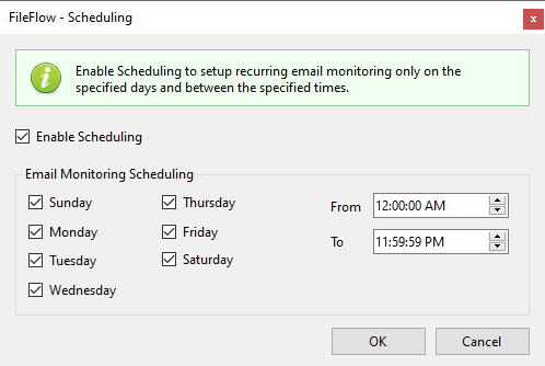 The FileFlow actively monitors the configured local or network folders for documents up to 24 hours a day. Need a break? You can set up a time schedule for folder monitoring. Simply select the desired days of the week and specify a time interval for starting and stopping the FileFlow Service. The FileFlow can also be configured to send only specific file formats, or filter files by name or size.