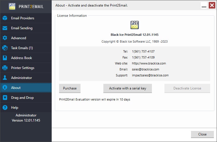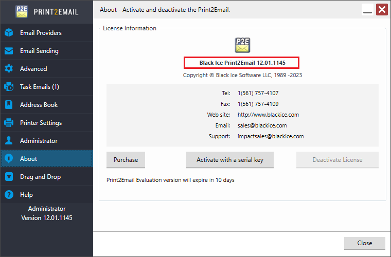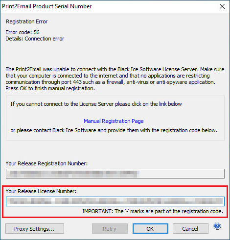 To Register/Activate the Print2Email a secure Internet connection is required to the Black Ice Software License Server through (HTTPS) port 443.