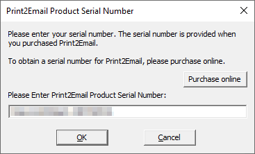 A window is displayed to Enter the serial number in the text field and press OK. The serial number can be found in the email body of the containing the download instructions for the Print2Email.
