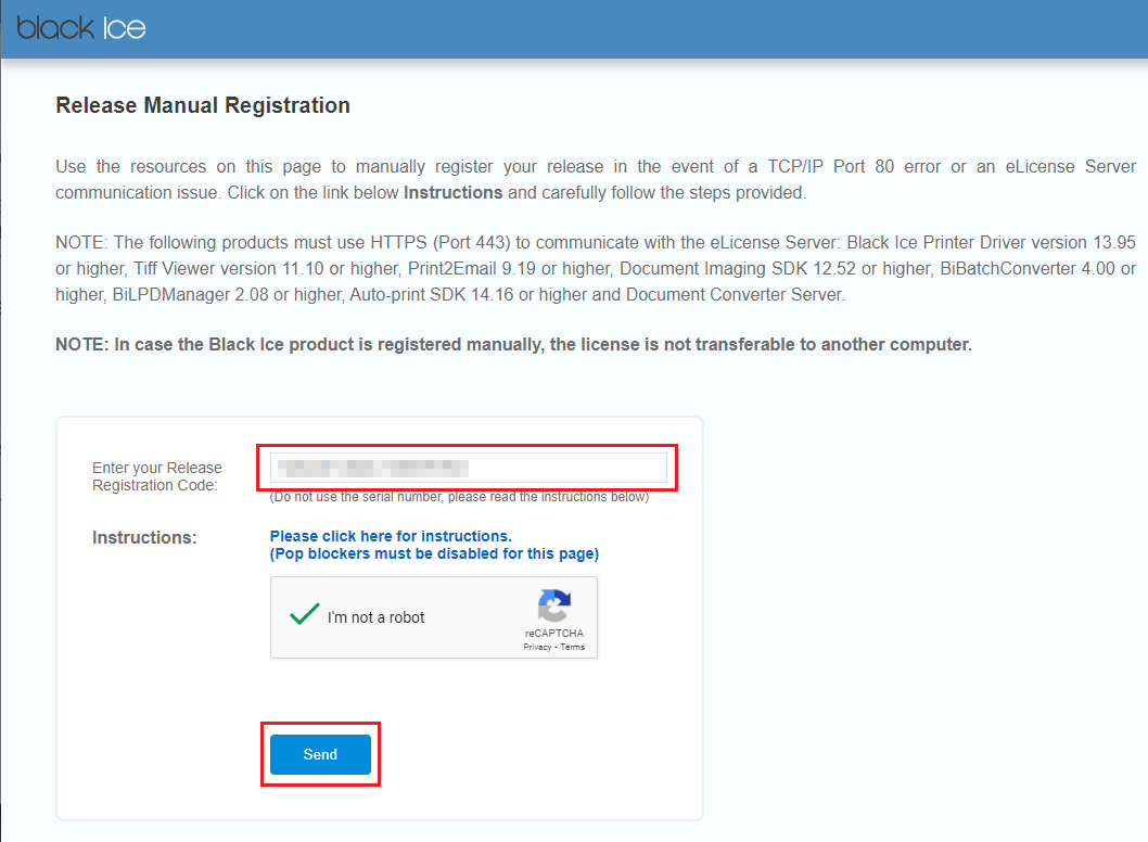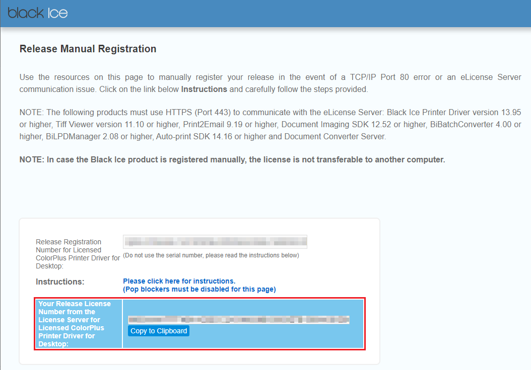 In a secured environment where the port 443 cannot be enabled, the software can be manually registered online. To receive a release license number immediately, please copy the release registration number from the installer window to the Enter your Release Registration Code field on the Release Manual Registration webpage as shown below.