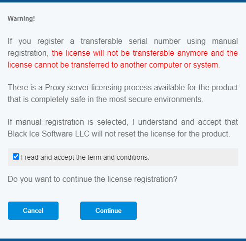 Click Cancel to abort the registration process (the license number remains transferable) or Continue to receive a Release License Number.