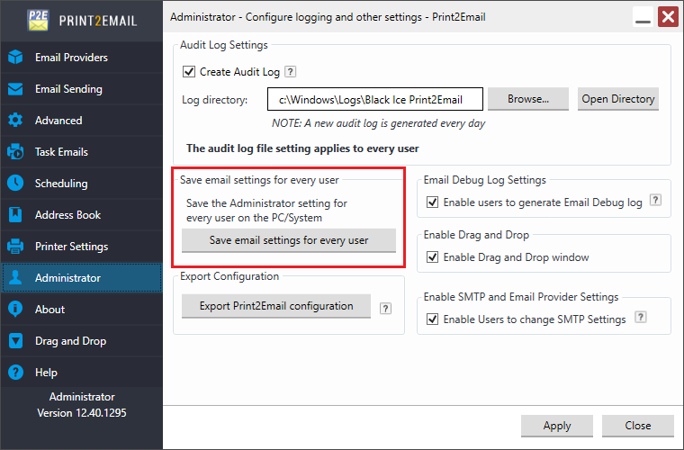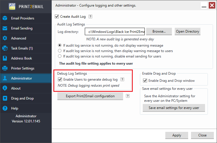 To enable users to generate debug log, open the Print2Email > Administrator tab and check the Enable Users to generate debug log checkbox.