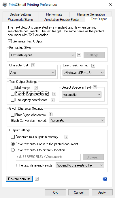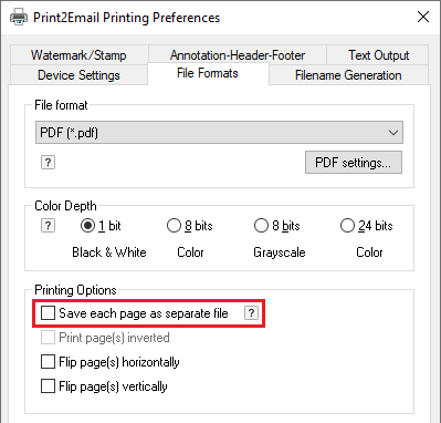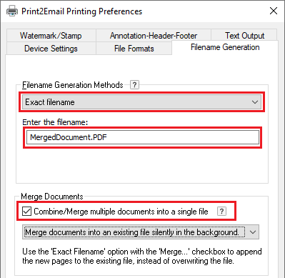 From now on, when printing multiple documents to the Print2Email and if the filename specified in the printer settings already exists, subsequent print jobs are appended to the file. If the file does not exist, the first print job creates the file and the following print jobs are appended to the file.