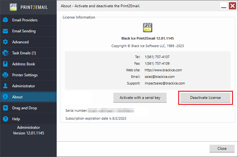 1. To deactivate and free up a license is quick and easy for IT managers in the Print2Email. The “Deactivate License” option enables IT administrators to reactivate the Print2Email on the computer at a later time.