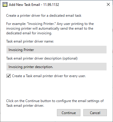 Task Emails allow the creation of new printers with predefined email settings based on the Print2Email printer. With Task Emails the user can create separate printers with pre-defined emails for routine tasks without having to repeat email configuration steps each time. The user can create as many Task Emails as necessary.