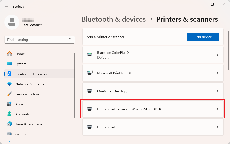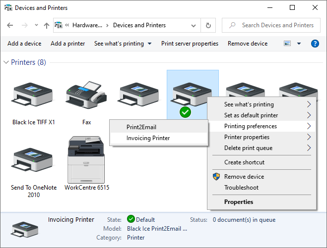 On Windows 11/10 and Windows server 2022/2019/2016/2012 the created Task Emails appear in the Control Panel > Devices and Printers in a grouped form under the Print2Email. Right-click on the Print2Email and go to Printing Properties / Printing Preferences for the Task Email.