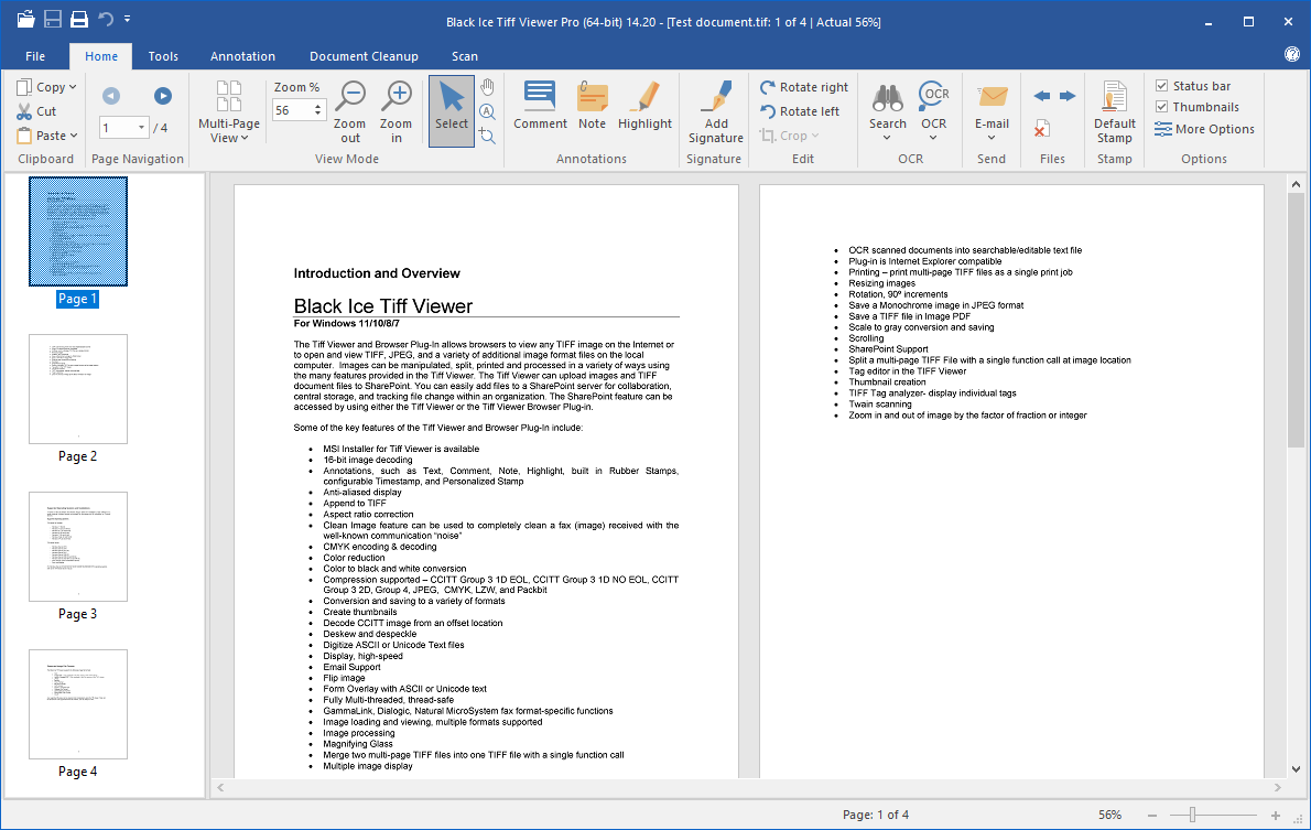 The TIFF Viewer Pro allows users to view, print, OCR, annotate, search (and redact highlighted search matches) documents, scan, batch scan, email, and edit TIFF images, Faxes, medical Faxes through the standalone user interface. The Tiff Viewer can display Microsoft Office Document Imaging (MODI) annotations, OCR data, and WANG annotations.
