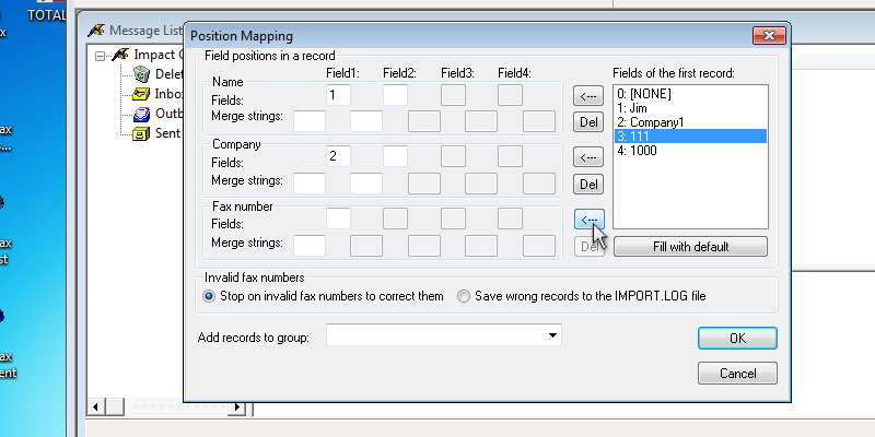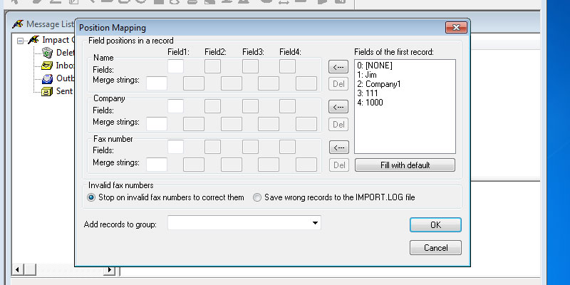 Start the Impact ColorFax from the Start menu.In the Impact ColorFax, go to the Tools > Phone Book > Import.Browse the phone list to be imported.The text file to be imported looks like this.The Position Mapping windows appears.Select the name field, represented by the first record in the text file to be imported, and click on the <-- button. The Name/Fields/Field1 text box shows that item 1 in the Fields of the first record will be imported into the Name field. When finished, select the Company, and click on the <-- button. The Company/Fields/Field1 text box shows that item 2 in the Fields of the first record will be imported into the Company field. When finished, select the Fax number, and click on the <-- button.In this case, the fax number is split into two fields. However, Impact Colorfax has built in functionality to solve this issue. When finished, select the group where to add the records.When finished click on the OK button.The Import Statistics window opens and displays the outcome of the attemted import. Click OK to close this windows.Go to the Tools > Phone Book > Edit option.The Phone Book windows opens. Select the group with the imported contacts, and click on the Show button.All contact in the group are shown. Thank you for using Impact ColorFax. Click here to go back to the Tutorials.