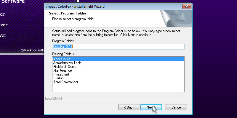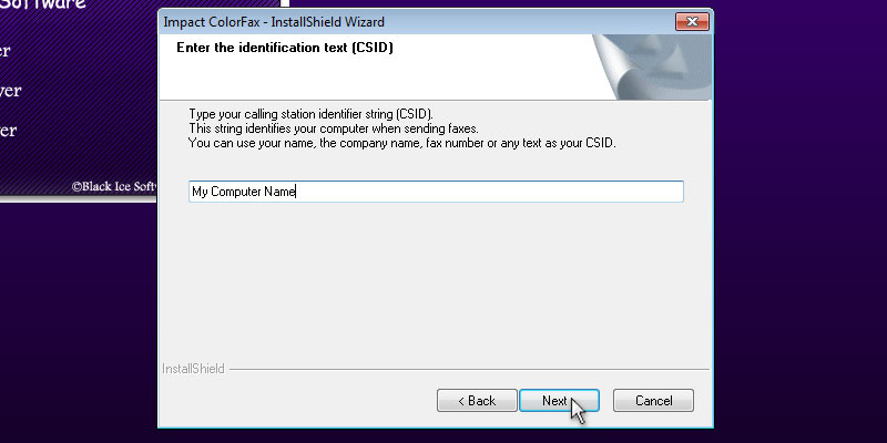To begin installation, double click on the downloaded ColorFax.The following screen will be displayed. Click the 'Next' button to continue.Review the license agreement, and press 'Yes' button to continue.Select the installation directory of the ColorFax or use the destination folder. Press 'Next' to continue.Specify the desired name for ColorFax to appear under Start > Programs or use the default settings. Press 'Next' to continue.Enter the identification text (CSID). The CSID identifies your computer when you send a fax. The information you insert into the CSID field is entered into the header of the fax. You can enter anything you want; however a typical CSID is your name, company or fax number.The following dialog will appear, and the user can select to 'Place program shortcut icon on desktop.' Press the 'Next' button to continue.Press Finish to complete the installation.