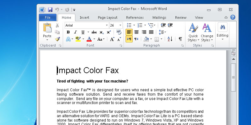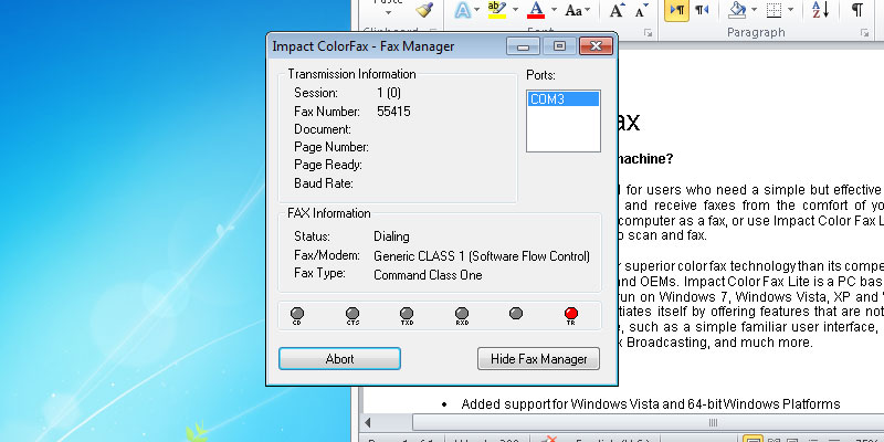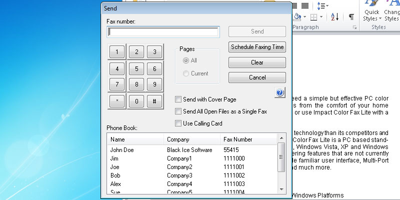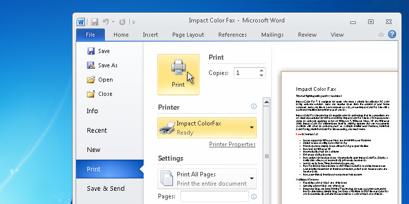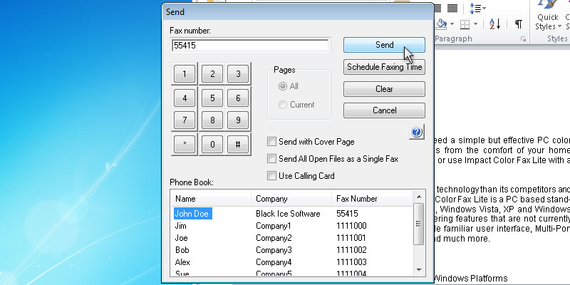 Open a document to be faxed.Print the document to the Impact ColorFax virtual printer driver.Impact ColorFax Send window opens automatically.Select the fax number from the Phone Book or enter the fax number manually, and click on the Send button.Impact ColorFax Fax Manager opens and send the printed document. Thank you for using Impact ColorFax. Click here to go back to the Tutorials.