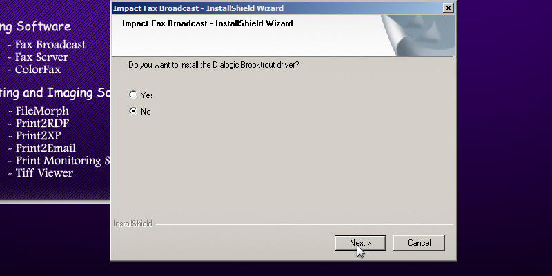 To run the Impact Fax Broadcast install, double click on the downloaded Impact Fax Broadcast.The following screen will be displayed. Click the 'Next' button to continue.Review the license agreement, and press 'Yes' to continue.Select the installation directory of the Fax Broadcast or use the default destination folder. Press 'Next' to continue.Specify the desired name to appear under Start > Programs or use the default settings. Press 'Next' to continue.Type the CSID (calling station identifer string). This string identifies the computer when sending faxes.The InstallShield Wizard will install the Impact Fax Broadcast.The following window will appear, and the user can select the desired options and press the 'Next' button to continue.A window appears asking if the user want to install Brooktrout Driver. A brooktrout card is a high-end faxing board. Select 'No' and press 'Next' to continue.The Select Modem or COM port window appears. The user can select and test which port is the modem connected to. Select the COM port or click the Skip button.Press Finish to complete the installation. Thank you for using Impact Fax Broadcast. Click here to see more tutorials.
