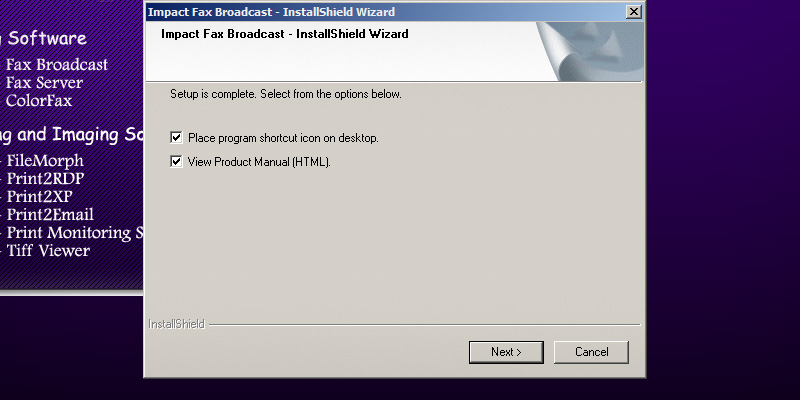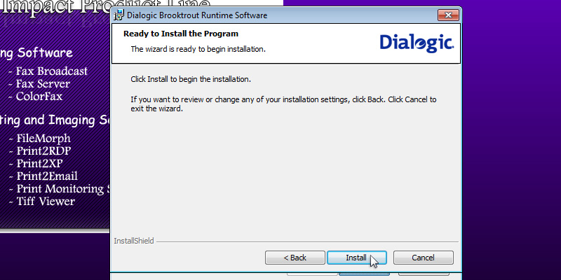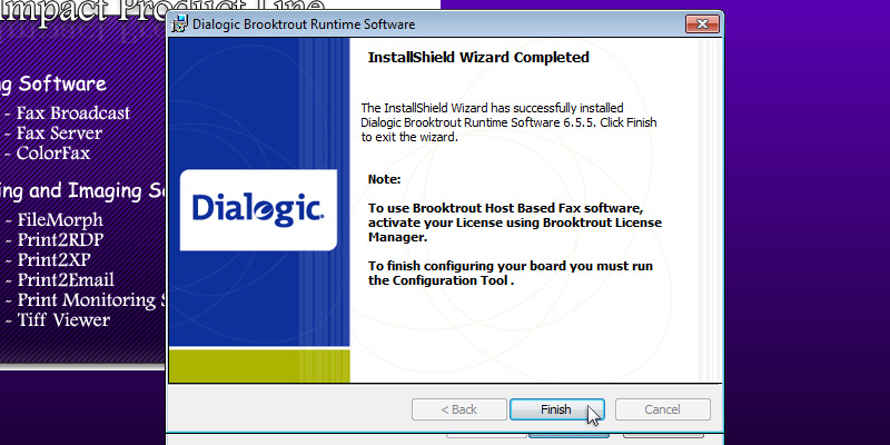 To run the Impact Fax Broadcast install, double click on the downloaded Impact Fax Broadcast.The following screen will be displayed. Click the 'Next' button to continue.Review the license agreement, and press 'Yes' to continue.Select the installation directory of the Fax Broadcast or use the default destination folder. Press 'Next' to continue.Specify the desired name to appear under Start > Programs or use the default settings. Press 'Next' to continue.Type the CSID (calling station identifer string). This string identifies the computer when sending faxes.The InstallShield Wizard will install the Impact Fax Broadcast.The following window will appear, and the user can select the desired options and press the 'Next' button to continue.A window appears asking if the user want to install Brooktrout Driver. A brooktrout card is a high-end faxing board. Select 'Yes' and press 'Next' to continue.The Dialogic Brooktrout Runtime Software installation program will automatically start. Press the 'Next' button to continue.Select the installation directory of the Brooktrout driver or use the default destination folder. Press 'Next' to continue.Click on the 'Install' button to begin the installation.The InstallShield Wizard will install the Brooktrout Driver.During the installation, a command line will appear as part of the installation.Click Finish to run the Configuration Tool.In Brooktrout Config Tool, the user can configure the Brooktrout board preferences. Click 'Yes' to configure the board now, otherwise click 'No'.The following window box will appear where the user can specify the location of the configuration files. When finished, click 'OK'.A Windows security alert may appear. Allow Brooktrout Configuration tool to communicate with public networks.The Brooktrout Configuration Tool Advanced mode contains essential information about how to use the Tool effectively. If finished, Save and close this window.To select the path of btcall.cfg window, click on the 'OK' button.Specify the location of the configuration file. If finished, click on the 'OK' button.The Select Modem or COM port window appears. The user can select and test which port is the modem connected to. Select the COM port or click the Skip button.Press Finish to complete the installation. Thank you for using Impact Fax Broadcast. Click here to see more tutorials.