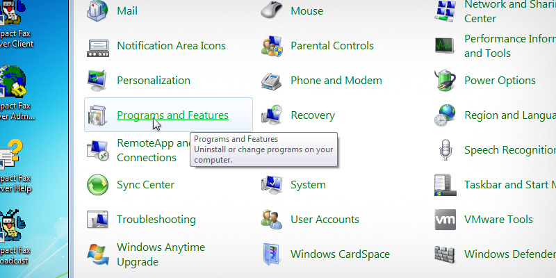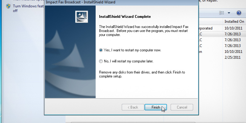 Go to Start menu and select Control Panel.In the Control Panel, click on the Programs and Features.Select the Impact Fax Broadcast and click on the Uninstall button.WindowsThe InstallShield Wizard opens. Select the Remove option and click NextWindows asks confirmation to remove the application and all of its features. Click the 'OK' button to continue.Select the components to keep and click Next to uninstall the Impact Fax Broadcast.Press Finish to complete the installation. Click here to see more tutorials.