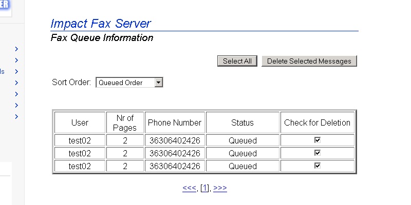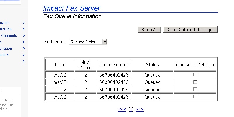 To reach the Impact Fax Server Administrator login, open a web browser and type localhost:1172 as a regular website. Enter the password and press Submit button.The Fax Server Administration page appears. All general information about the server can be found on this Main page.Go to the Server Administration > Fax Queue Information.The Impact Fax Server Fax Queue Information page appears. To delete one fax item check the checkbox under the Check for Deletion column, and press Delete Selected Messages button.The following dialog appears. Click the OK button to delete the selected fax item.To delete every fax item click on the Select All button, and press Delete Selected Messages button.The following dialog appears. Click the OK button to delete every fax item.The empty Fax Queue Information page appears. Thank you for using Impact Fax Server. Click here to see more tutorials.