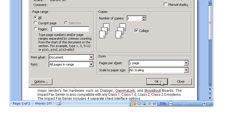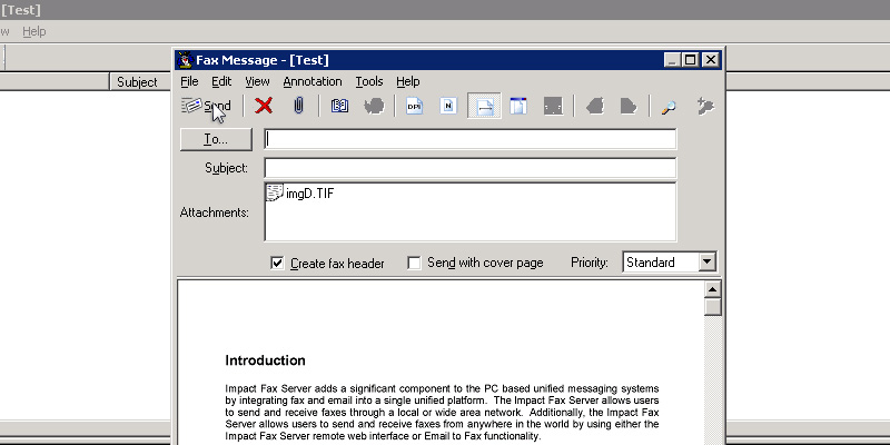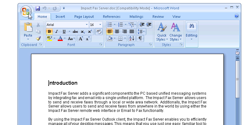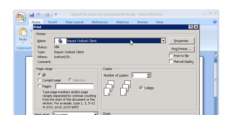 Impact Fax Server includes a convenient printer driver with each of its clients. The Stand Alone Fax Client (SACL) shows in the printer list as Impact Standalone Client.Printing to the Impact Standalone Client and Impact Outlook Client printer will automatically convert any document into a fax and attach it in a New Fax Message.Open the document or image to be faxed.Print the document or image to be faxed.In Microsoft Word 2007 the print option is in the Office Button ( top left corner ) > Print > Print.Select the Impact Stand Alone Client printer to fax with the Impact Stand Alone Fax Client.Select the Impact Outlook Client printer to fax with the Impact Outlook Fax Client.Select the Impact Fax Server printer to fax with the Impact Fax Server.When the selection is finished, click on the OK button to print.( or Print button, depends on the application )The Fax Message dialog appears with the printed document or image as an attachment. Thank you for using Impact Fax Server. Click here to see more tutorials.