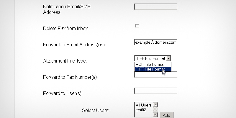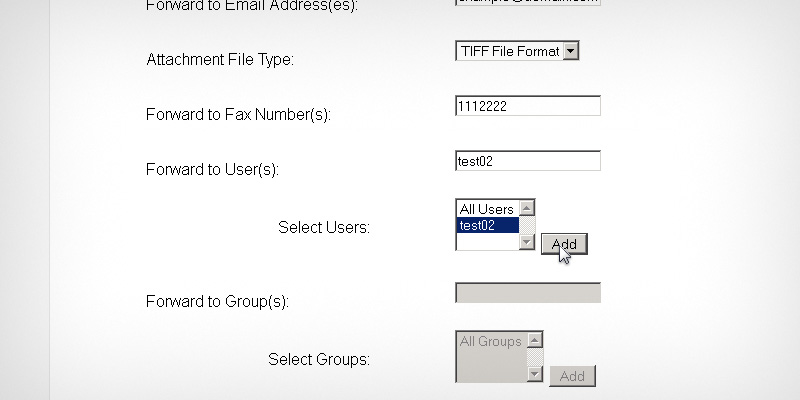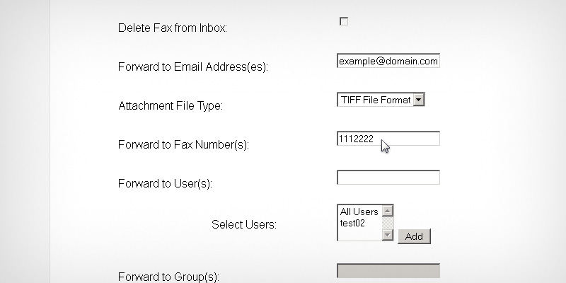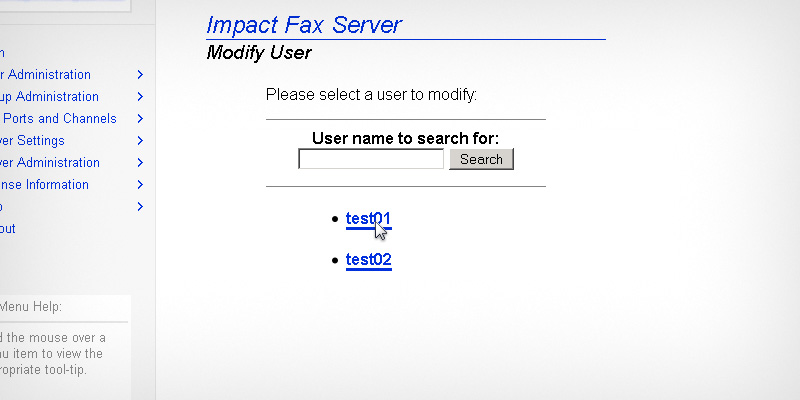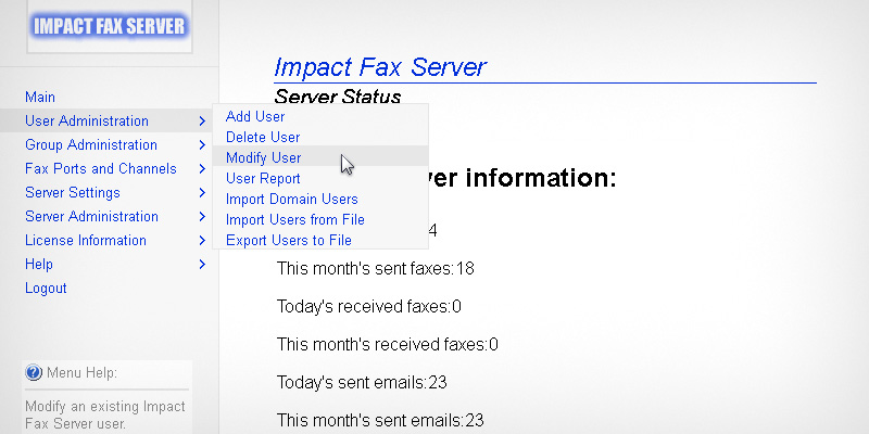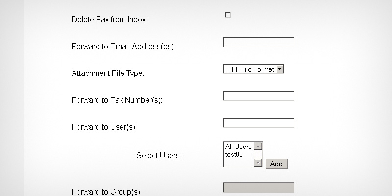 To reach the Impact Fax Server Administrator login, open a web browser and type localhost:1172 as a regular website. Enter the password, and click on the 'Submit' button.The Fax Server Administration page appears. All general information about the server can be found on this Main page.To configure the Fax forwarding, go to the User Administration > Modify User.Select the User that you wish to forward faxes from.Scroll down the Modify User page to find the Forwarding options. The user can forward faxes as an Email Attachment, Forward to a Fax Number, Forward to User(s), and/or Forward to Groups.Enter the email address to forward faxes to beside Forward to Email Address(es)Select the file format of the delivered attachments from the Attachment File Type dropdown list.To forward faxes to a specified fax number, enter the fax number beside Forward to Fax Number(s).To forward faxes to specified user(s), select the user from the Select Users list, and click on Add button. When finished, click on the Submit button on the bottom of the page.If the user information is successfully modified, the following page appears. Thank you for using Impact Fax Server. Click here to see more tutorials.