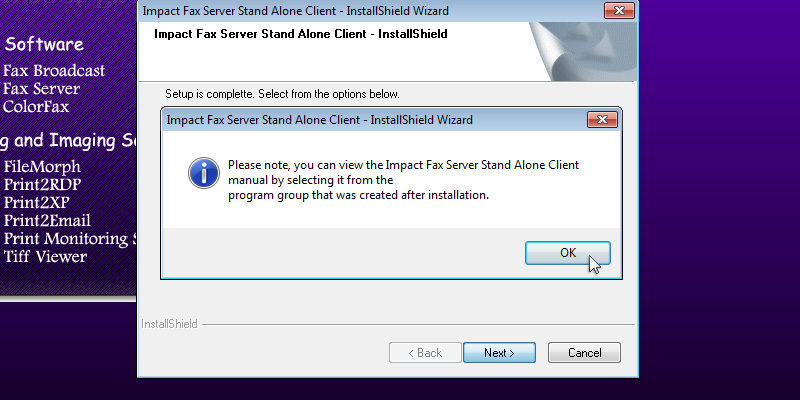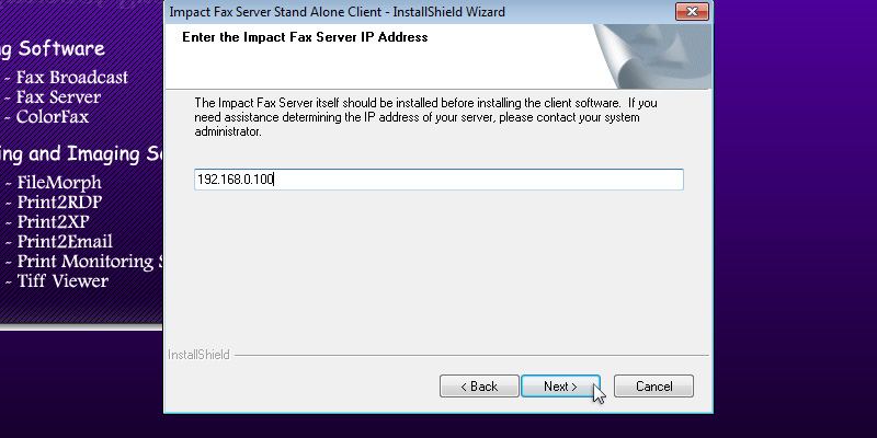 Run the Impact Fax Server installer, and select the Impact Fax Server Standalone Client product to begin the installation.The following screen will be displayed. Click the 'Next' button to continue.Review the license agreement, and press 'Yes' to continue.The next screen will present an option of installing Standalone Client for all users or just the current user. Press 'Next' to continue.Enter the IP address of the Fax Server.Select the installation directory of the Standalone Client or use the default destination folder. Press 'Next' to continue.The InstallShield Wizard will install the Standalone Client.The following dialog will appear, and the user can select the desired options and press the 'Next' button to continue.Press Finish to complete the installation. Thank you for using Impact Fax Server Standalone Client. Click here to see more tutorials.