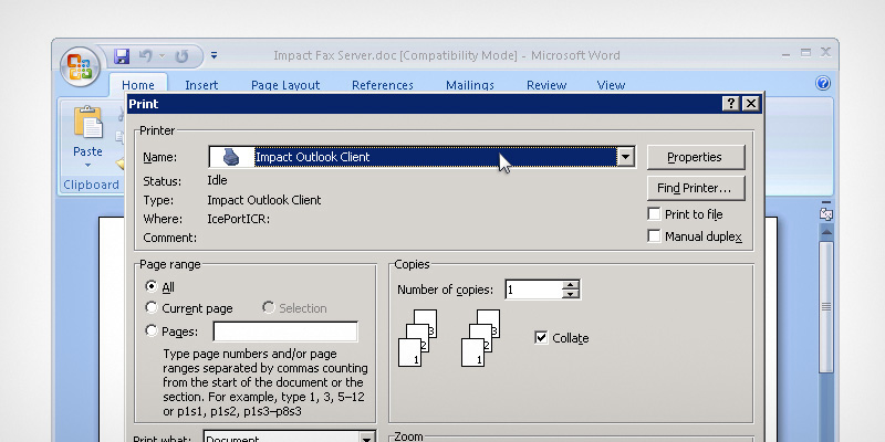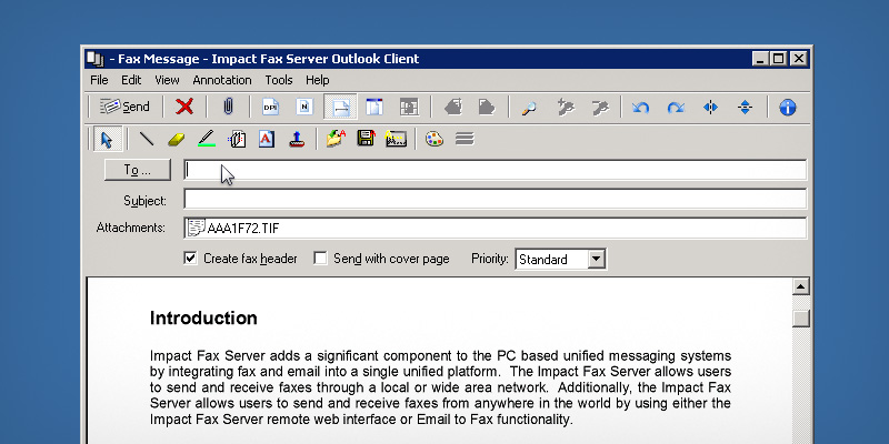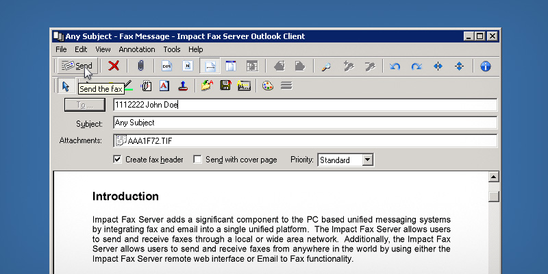Printing to the Impact Outlook Client printer will automatically convert any document into a fax and attach it in a New Fax Message.Open the document or image to be faxed.Print the document or image to be faxed.In Microsoft Word 2007 the print option is in the Office Button ( top left corner ) > Print > Print.Select the Impact Outlook Client printer to fax with the Impact Outlook Fax Client.The Fax Message dialog appears with the printed document or image as attachment.Type the fax number beside To... button. Optionally the user can add an username after the fax number, separated by a simple space character or click on the button to view contacts from Address Book.Type any subject beside the Subject.When finished, click on the Send button to send the fax. Thank you for using Impact Fax Server Outlook Client. Click here to see more tutorials.
