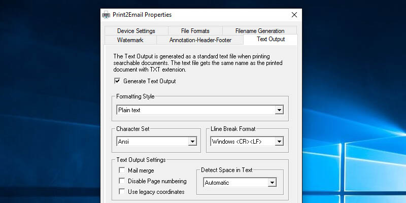 Click on the 'Printer Settings' on the Print2Email user interface.In the Printing Preferences, go to the Text Output tab and make sure the 'Generate Text Output' option is checked. When finished, press Apply, and then press the OK button.Open the file what you want to convert to a text only email.Print the document to the Print2Email.When the printing is done, a message dialog will pop up with the extracted text. Thank you for using Black Ice Print2Email. Click here to see more tutorials.