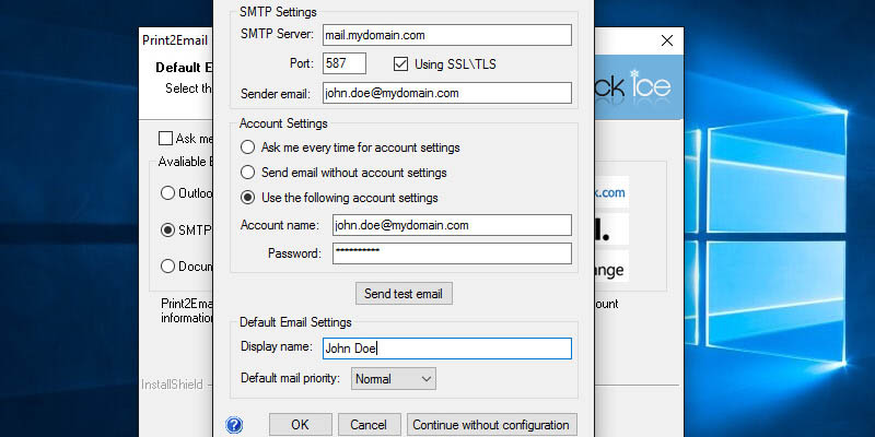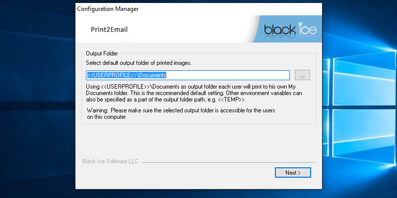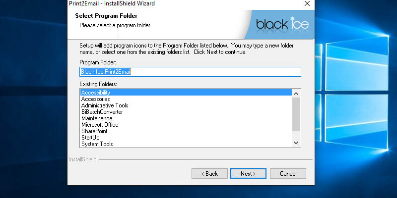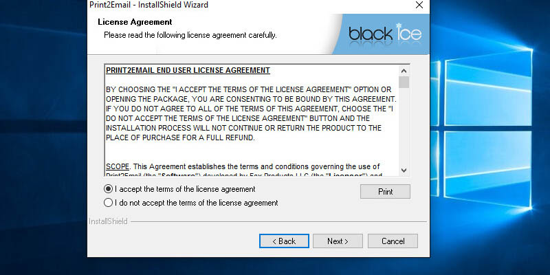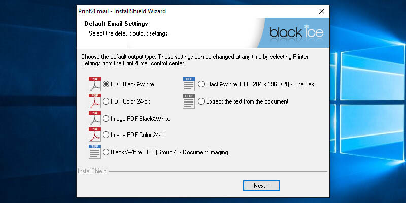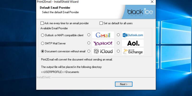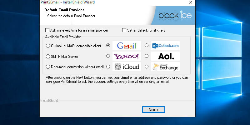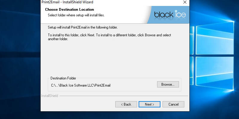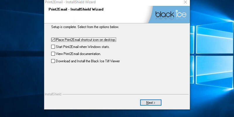 To begin installation, double click on the downloaded Print2EmailSetup.exe. The following screen will be displayed. Click the 'Next' button to continue.Review the license agreement, and select 'I accept the terms of the license agreement' radio button. Press 'Next' to continue.The next screen will present an option of installing Print2Email for all users or just the current user. Press 'Next' to continue.Select the installation directory of the Print2Email or use the default destination folder. Press 'Next' to continue.Specify the desired name for Print2Email to appear under Start > Programs or use the default settings. Press 'Next' to continue.The InstallShield Wizard will install the Black Ice Print2Email.Specify the output directory of the converted documents.Print2Email Demo automatically registers the Demo during installation. A dialog will appear confirming that the Print2Email Demo has successfully registered over the internet.The following dialog box will now appear and prompt you for the file type for the image attachments. Select the desired file format and press Next to continue. Please note: The user can change the image type at any time using the 'Printer settings' in the Control Center.The following screen will present options to configure what Print2Email should use as the default E-mail provider. You can configure these options later in the Print2Email Control Center.The user can select the commonly used email providers by select the radio button, and enter the email address and password.When a commonly used email provider was selected, such as Gmail, click on the Next button to configure the account settings.The user can configure the SMTP settings by selecting the 'SMTP Mail Server' radio button, and click on the Next button.In the SMTP Settings, enter all the required information of the SMTP server.Print2Email can be used as a stand alone document converter without email configuration by selecting the 'Document conversion without email' radio button.The following dialog will appear, and the user can select to 'Place program shortcut icon on desktop,' 'Start Print2Email when I start Windows,''View Print2Email Documentation' and 'Install The Free Tiff Viewer.' Press the 'Next' button to continue.Press 'Finish' button to complete the installation. Thank you for using Black Ice Print2Email. Click here to see more tutorials.
