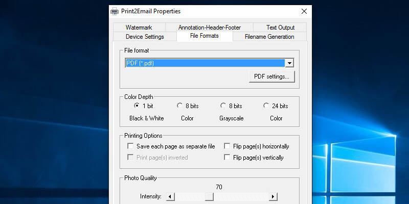 On Print2Email Control Center, click on the Email Settings option.Under the Email Providers tab, select the Document Conversion without email option, and click OK to apply the changes. From now on, when printing to the Print2Email, the software will only convert and save the document, without sending it in email.On the Print2Email Control Center, click on the Printer Settings option.In the Printer Settings, one can configure the document conversion with Print2Email.