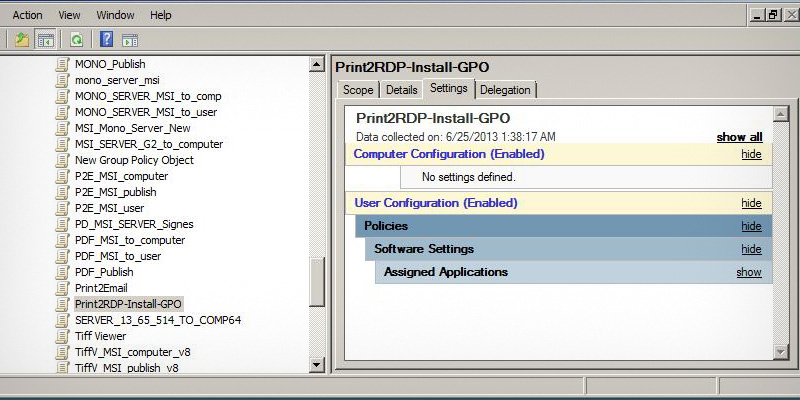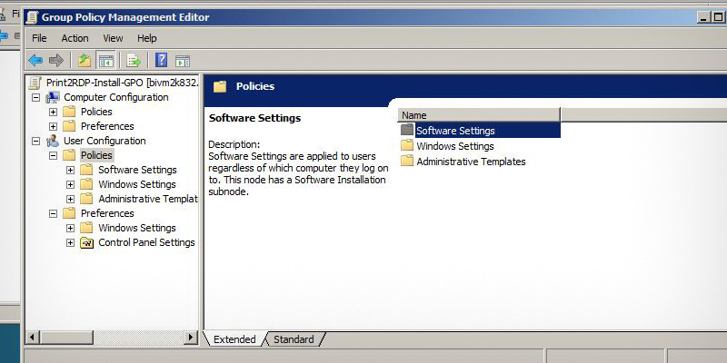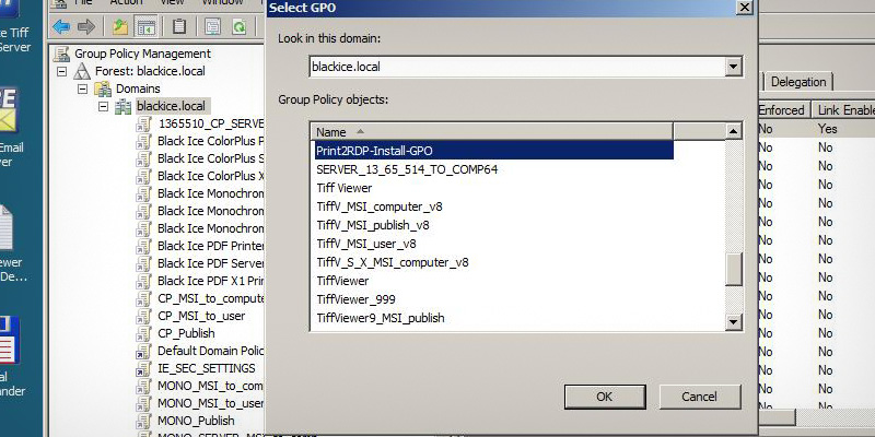 Before start, make sure that the deployable Print2RDP MSI file is in the shared folder (Distribution Point) and the folder has the appropriate rights. An existing transformation is needed to complete this tutorial. New transformation file can be created easily following our How to use MSI Client Install documentation.Go to the Start > Administrative Tools > Group Policy Management.In the Group Policy Management, expand the Forest and Domain.Select the Group Policy Object category.Right click on the Group Policy Object category, and click New.Enter the name of the new Group Policy Object, and click Ok to create the new object. When finished, double click on the created Group Policy Object.In the selected Group Policy Object, click on the Settings tab, right click on the panel and select the Edit.The Group Policy Management Editor opens. The Administrator can assign the deployable product for users or computers in the domain. Now the product will be assigned to a User.Double click on the User Configuration item.Double click on the Policies item.Double click on the Software Settings item.Double click on the Software installation item.Right click on the Software installation panel, and select New > Package...Browse the distribution point folder, select the MSI package and click Open.Select Advanced, and OK.In the Properties, go to the Modifications tab, and click on Add button.Browse the folder where the transformation file is located. Select the file, and click the Open buton.In the Properties, go to the Deployment tab, and select the Assigned at the Deployment type area, and basic at the Installation user interface options area. Click Ok when finished, and close the GPO Editor.In the Group Policy Management, select Scope tab.Under the Scope tab, the Authenticated Users group applies to every user who logs in. In this case it will only be deployed to one user. Select Authenticated Users and click on Remove.Click OK.Click Add... button to add users.Check only the Users, and click Ok.Click on the Advanced... button.Click Find Now button, and select the users to add. When finished, go back to the Group Policy Management.The Administrator need to link this GPO to a domain. Right click on the domain, and select Link and Existing GPO...Select the Group Policy Object, click OK, and the Group Policy Object has been configured. The product will be deployed when the user logs in. Thank you for using Black Ice Print2RDP. Click here to go back to the Tutorials.