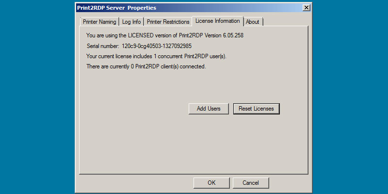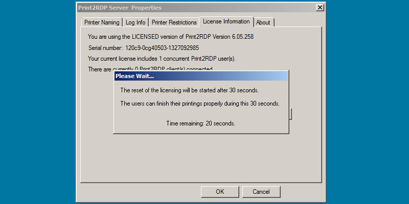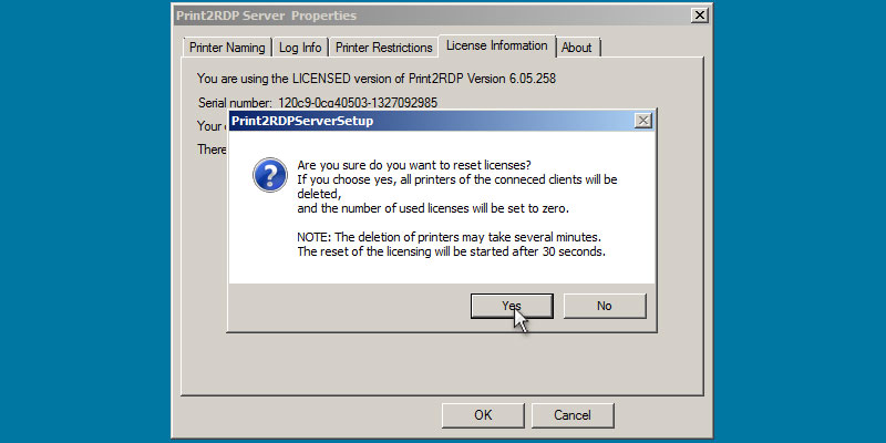 Go to Start menu and start the the Print2RDP Server.In the Print2RDP Client Properties, go to the License Information tab to see the current license. To reset the licenses, click on the 'Reset Licenses' button.The following dialog will pop up. If the user click 'Yes', the connected printers will be deleted, and the number of used licenses will be set to zero.Once the process is complete they will be prompted to log off and start a new session to recover their printers. Thank you for using Black Ice Print2RDP. Click here to go back to the Tutorials.