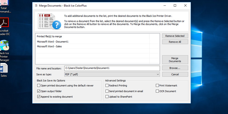 Go to Control Panel > Devices and Printers.Right-click on the Black Ice Printer Driver, and select the Printing Preferences.In the Printing Preferences, go to the Filename Generation tab check the 'Combine/Merge multiple documents into a single file' option.When finished, press the OK button.Now printing to the driver will show up the Merge Documents window. Click on the Merge Documents button to merge the listed documents into one single file. Thank you for using Black Ice Printer Driver. Click here to see more tutorials.