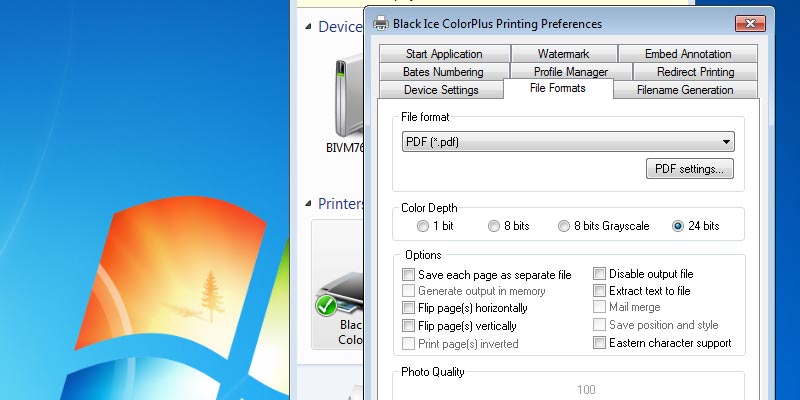 Click on the Start button, and select Devices and Printers.Right-click on the Black Ice Printer Driver, and select the Printing Preferences.In the Printing Preferences, go to the File Formats tab and make sure the 'Save each page as separate file' option is unchecked, and the selected file format supports the multi-page images.When finished, press Apply, and then press the OK button. Now printing a multi-page document to the driver will create a single document in the desired format. Thank you for using Black Ice Printer Driver. Click here to go back to the Tutorials.