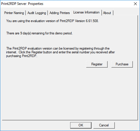 To register the Print2RDP during the demo period, open the Print2RDP Server > License Information and click Register (administrator privileges required).
