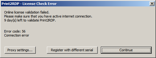 If the time period for the online validation is expired, and Print2RDP was unable to validate the license due to the lack of active internet connection, Print2RDP offers the following options: