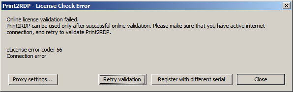 In order to make sure that your license is validated, please enable the internet connection on the computer, and restart the Print2RDP to initiate the license validation at least once in every month. The validation is an automated process; Print2RDP will only notify the user about occurring errors.