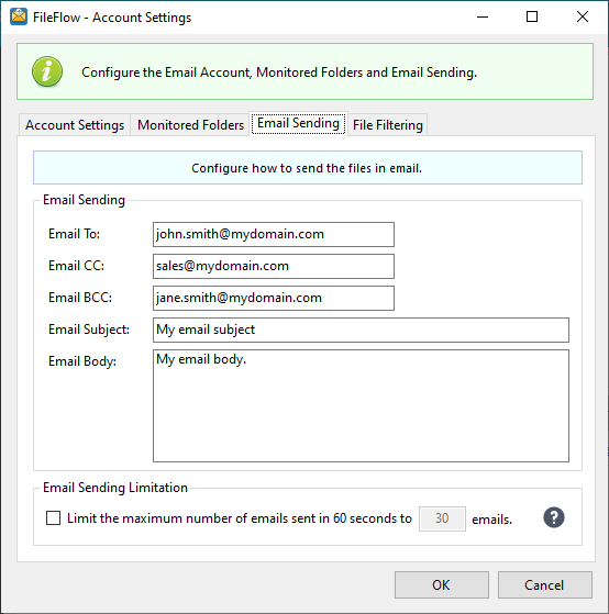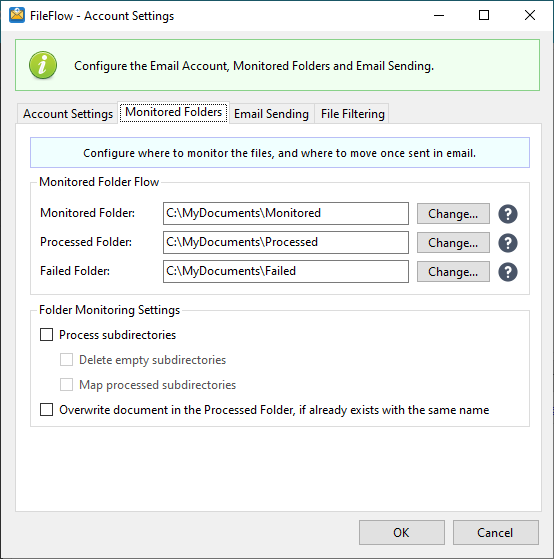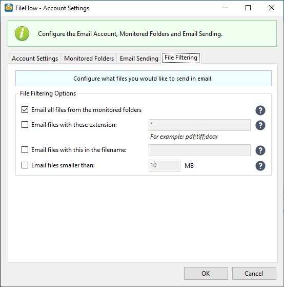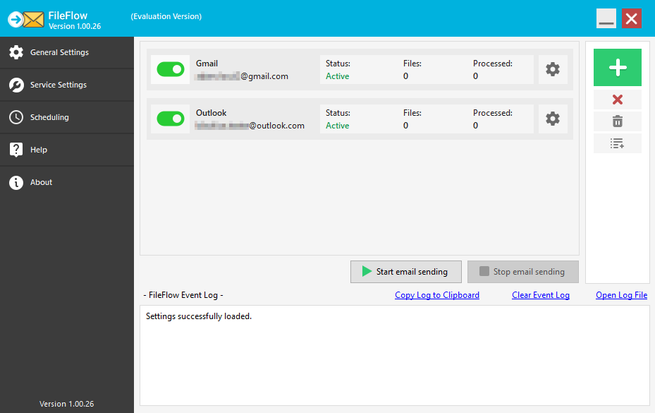 The FileFlow is a service-based 24/7 email-sending application, that runs in the background, actively monitors predefined folders, and silently sends incoming documents as attachments in email with preconfigured email settings. The FileFlow provides an easy-to-use, intuitive user interface for configuring email sending and folder monitoring.