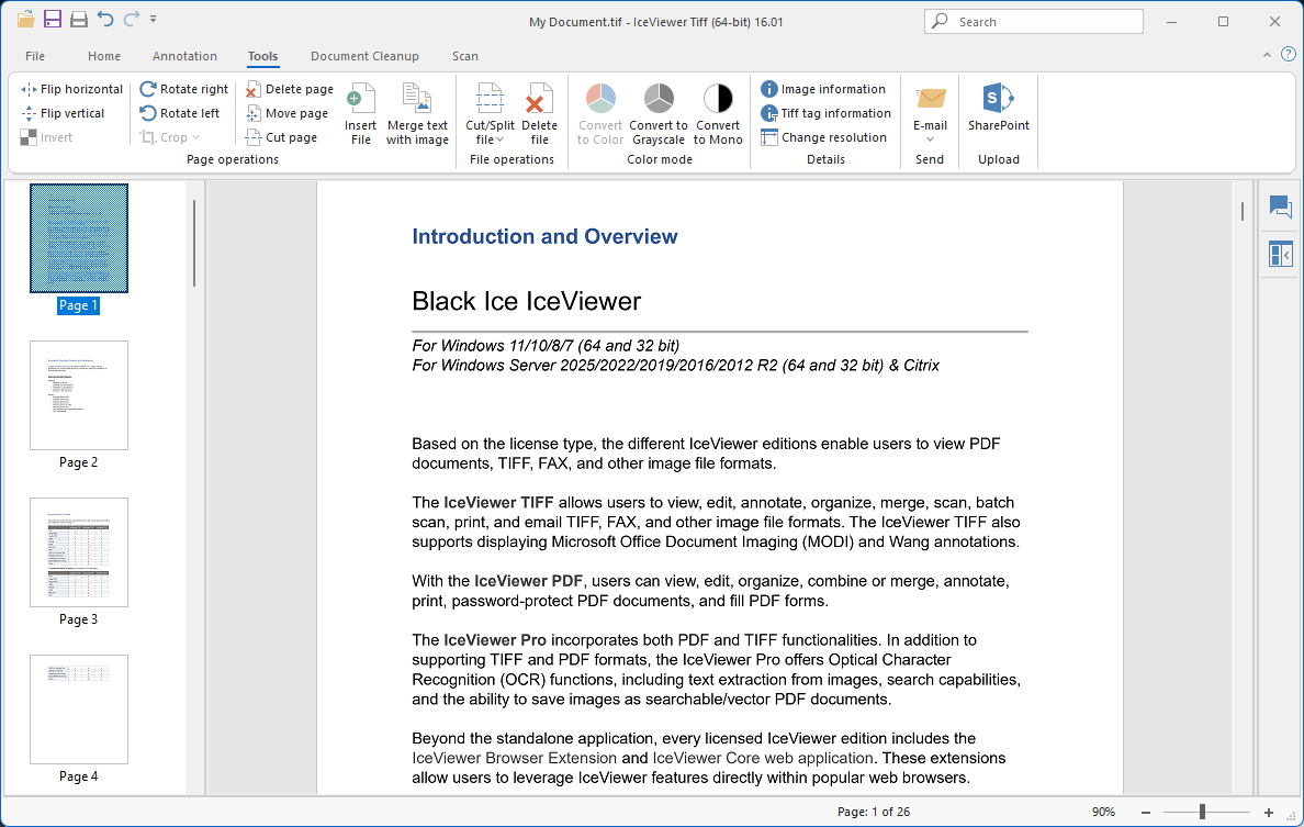 The IceViewer TIFF offers a variety of view modes including multipage, fit-to-window, fit-to-width views, and more...