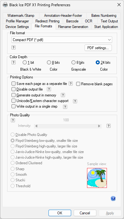 The Black Ice PDF X1 Printer Driver can print to Standard PDF, Compact PDF, PDF Image, PDF/A file formats, and supports PDF Linearization (Fast Web Viewing).