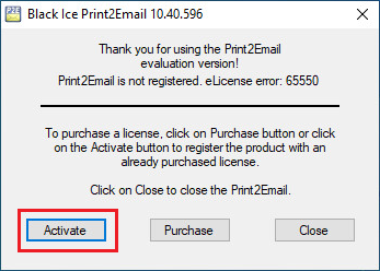 To register the Print2Email during or after the demo period, click on the Activate button on the appearing window when launching the Print2Email (registration requires administrator privileges).
