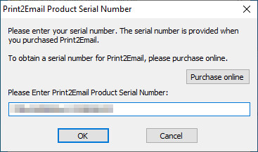A window is displayed to Enter the serial number in the text field and press OK. The serial number can be found in the email body of the containing the download instructions for the Print2Email.