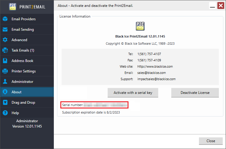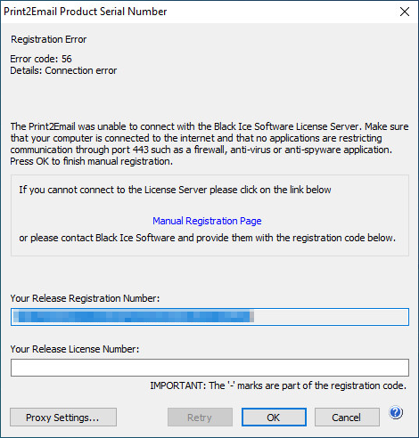 To Register/Activate the Print2Email a secure Internet connection is required to the Black Ice Software License Server through (HTTPS) port 443.