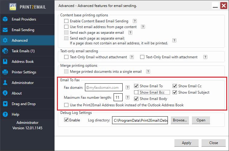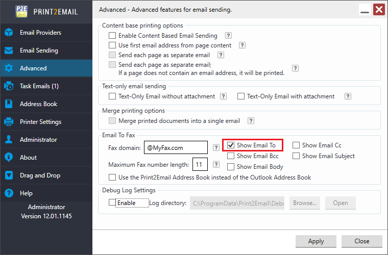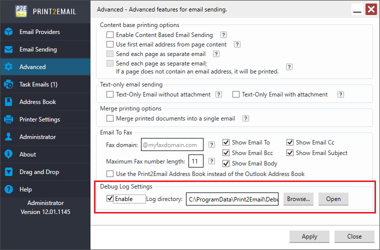 To enable users to generate debug log, open the Print2Email > Administrator tab and check the Enable Users to generate debug log checkbox.