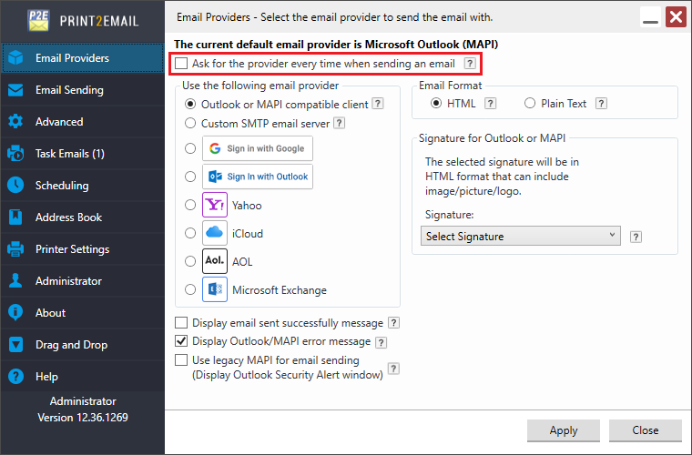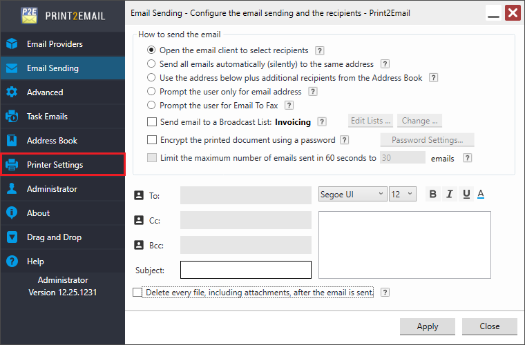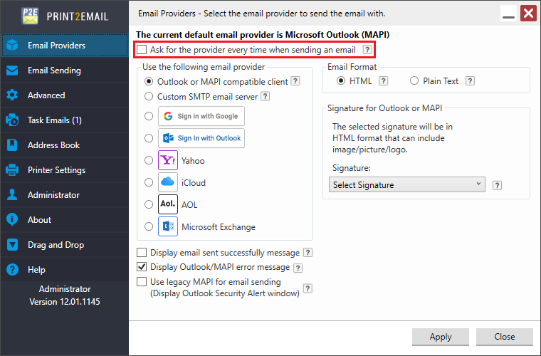 Note: Please make sure the Print2Email application is launched with “Run as administrator” privilege.