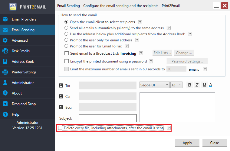2. Go to Print2Email > Email Sending tab, and uncheck the Delete every file, including attachments, after the email is sent option.