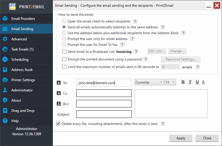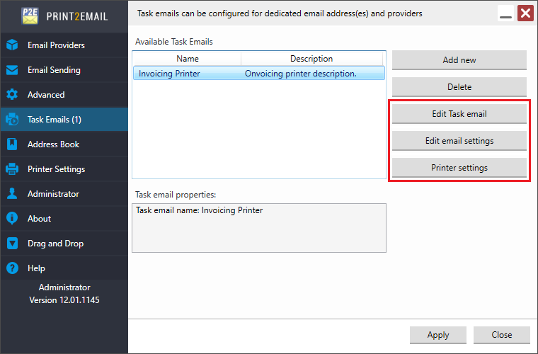 Task Emails allow the creation of new printers with predefined email settings based on the Print2Email printer. With Task Emails the user can create separate printers with pre-defined emails for routine tasks without having to repeat email configuration steps each time. The user can create as many Task Emails as necessary.