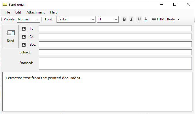 With these settings, if the user prints a document to the Print2Email, when the print job finished the email sending dialog pops up with the extracted text.