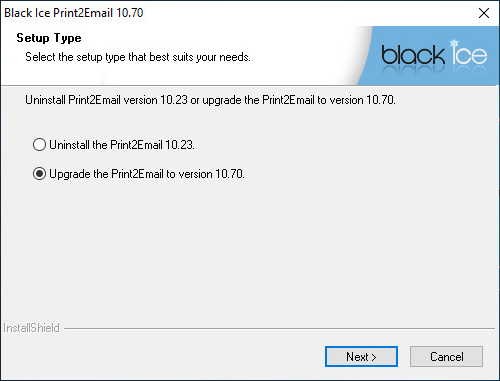 When starting the Print2Email installer the following window appears. To update Print2Email please select Upgrade the Print2Email... and click Next.